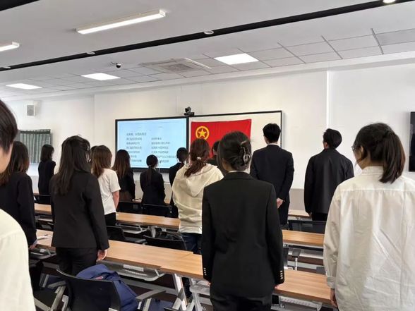 全体团员面向团旗,高举右拳,在领誓人郁旻瑞同学的带领下庄严宣誓:“我志愿加入中国共产主义青年团……”。铿锵有力的誓言在教室回荡着,展现了新时代青年的责任与担当。仪式圆满结束。