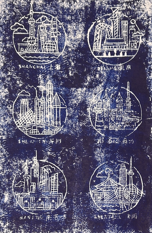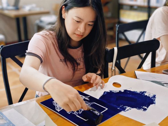 拓印环节最富仪式感。同学们以滚筒均匀蘸取油墨,在版面上反复碾轧至着色均匀,而后覆盖宣纸,用马莲工具由中心向四周耐心按压。当纸张轻轻揭起,青灰的木板底色与明丽的油墨色彩相互映衬,一幅独一无二的版画作品就此诞生。图案从单色线条变为立体画作,见证了从构思到落地的完整创作闭环。